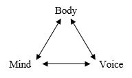 All the skills needed in the actor are located either (a) primarily in one of the three corners of the triangle or (b) in combinations. The repertoire of exercises employed in the BLT introductory workshop (ie. basic skills and knowledge) may be put into the following clusters, based on the skill areas they aid: